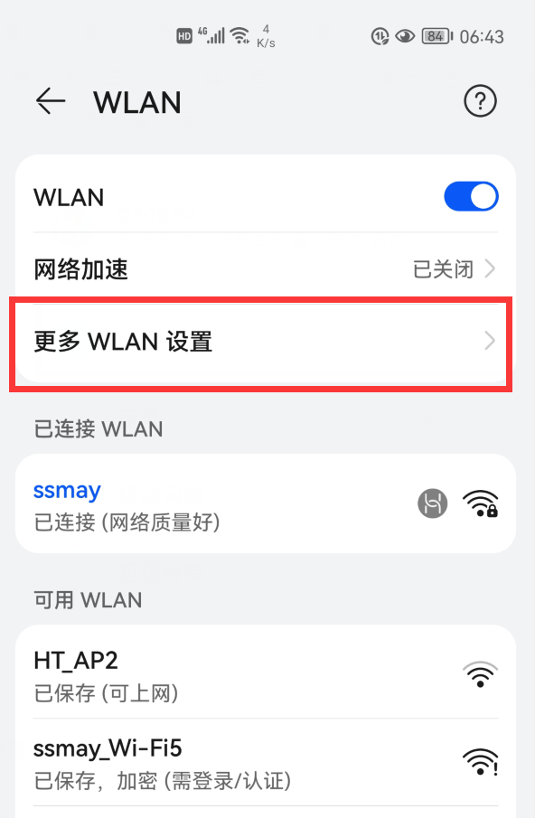 因为开启了第二个功能——智能WIFI,我们在进入到自家WIFI时,基本上都不再输入WIFI密码。时间久了,我们可能会忘记自己家里的WIFI密码。有朋友到我们家里来玩,想用我们家里的WIFI,可是我们把密码忘记了,是不是很尴尬?这个时候,该怎么办?还好,华为手机内置了一种功能,可以快速查看WIFI密码。方法很简单,打开手机的设置,点击“WLAN”,这时,会显示所有的WIFI列表,如下图。